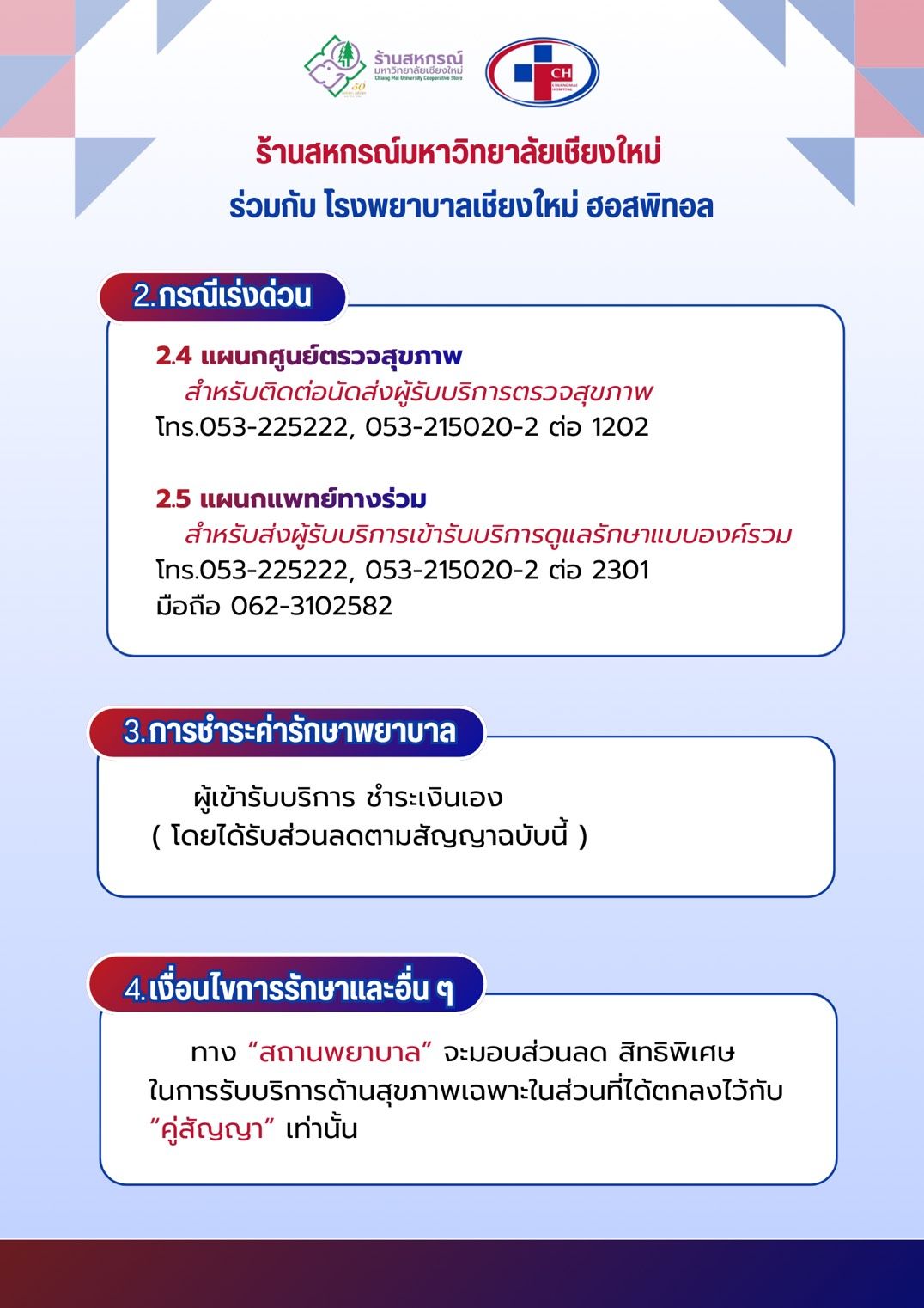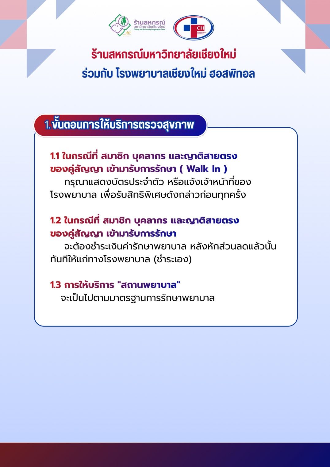 ร้านสหกรณ์ มหาวิทยาลัยเชียงใหม่ จำกัด ตกลงเป็นคู่สัญญาในการใช้บริการสุขภาพทุกครั้งที่มี “คู่สัญญา” เข้ารับบริการ ด้านสุขภาพและการบริการที่เกี่ยวข้องให้ “สถานพยาบาล” เรียกเก็บเงินจาก “ผู้รับบริการ” โดยตรง ณ จุดชำระเงิน ทาง สถานพยาบาล จะมอบสิทธิพิเศษในการดูแลรักษาสุขภาพกับสมาชิกสหกรณ์บุคลากร และญาติ ตามรายการในเอกสารแนบท้ายสัญญานี้ฉบับนี้